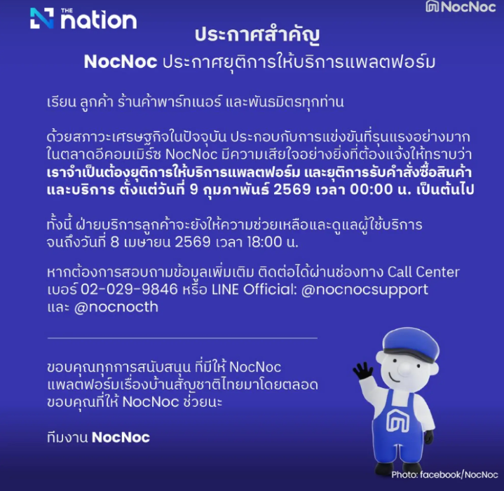 AMZDH获悉,近日,泰国媒体传来重磅消息:本土大型电商平台NocNoc的运营方BetterBe Marketplace已正式通知泰国电子交易发展局(温馨提醒:泰国的NocNoc平台,不同于拉美的Nocnoc,拉美的Nocnoc为平台的店中店模式),将于2026年2月9 日午夜起全面停止运营。这一公告不仅宣告了一个本土电商品牌的落幕,更标志着泰国最后一家大型本土电商市场平台彻底退出历史舞台。