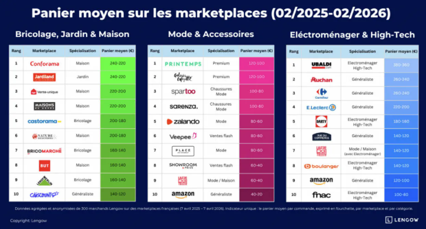 AMZDH获悉,根据电商管理平台Lengow的最新研究,2025年4月至2026年4月期间,法国电商市场呈现出明显的消费分层现象。垂直类平台凭借专业服务拿下高客单价订单,而亚马逊等综合平台则在时尚等高频品类中陷入低价内卷,客单价最低已探至20-40欧元。