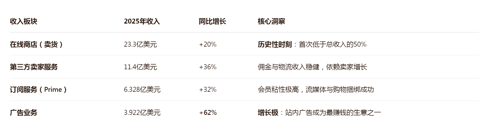 财报中最值得卖家关注的数据,是亚马逊盈利逻辑的彻底重构: