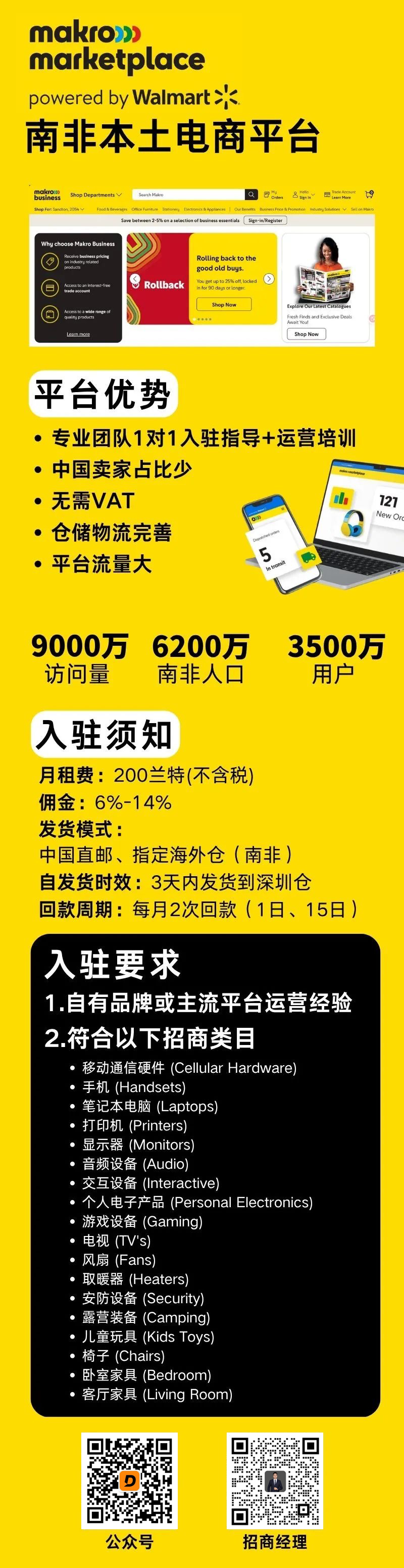 在南非电商渗透率突破25%的临界点,Makro凭借沃尔玛的供应链基因与本土化运营能力,正成为跨境卖家掘金非洲的桥头堡,也可以作为Takealot卖家的重要补充。平台对于精品卖家及铺货型卖家均适合,2025年正是入局南非电商的最佳窗口期。入驻南非电商平台Makro或Takealot,就找AMZDH跨境服务,欢迎扫码进群或者添加客服咨询。