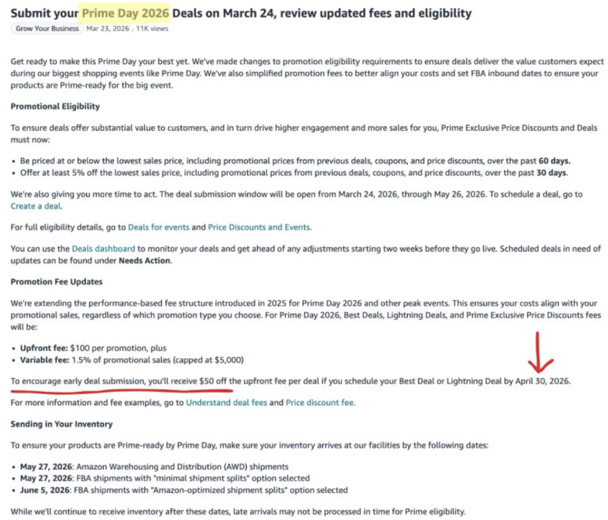 早鸟优惠:如果在2026年4月30日前提交Best Deal或Lightning Deal,每个促销可减免50美元固定费用(实付50美元)。